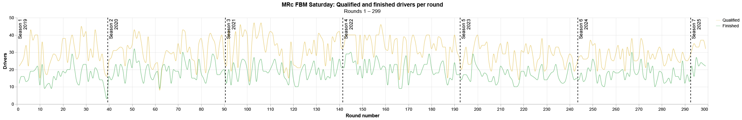 MRc FBM Saturday attendance chart (the number of qualified and finished drivers per round). See file history comments for info about temporal range of data (round numbers). Created with vega-lite.